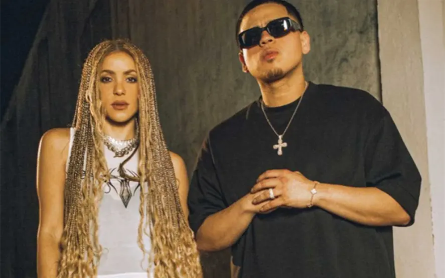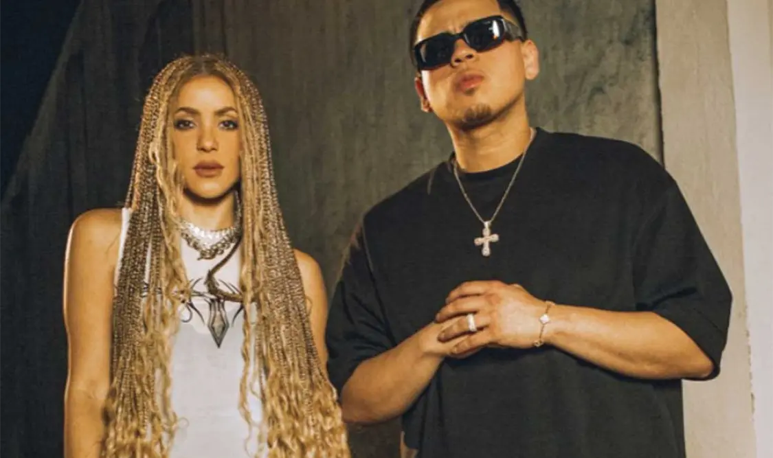 En el momento en el que Shakira dirige una estrofa a su exsuegro, uno de los integrantes de Fuerza Regida pretende taparle la boca, en un tono burlón al verso que está por cantar la colombiana.