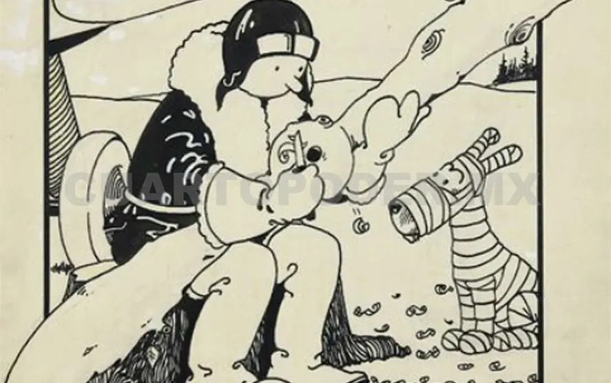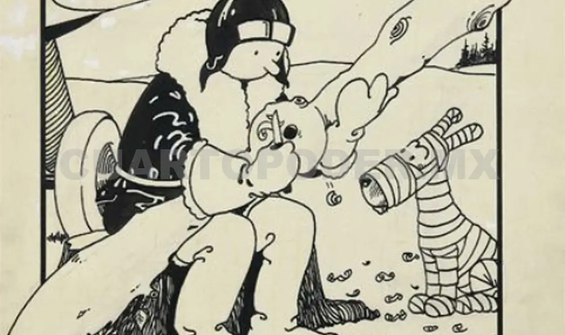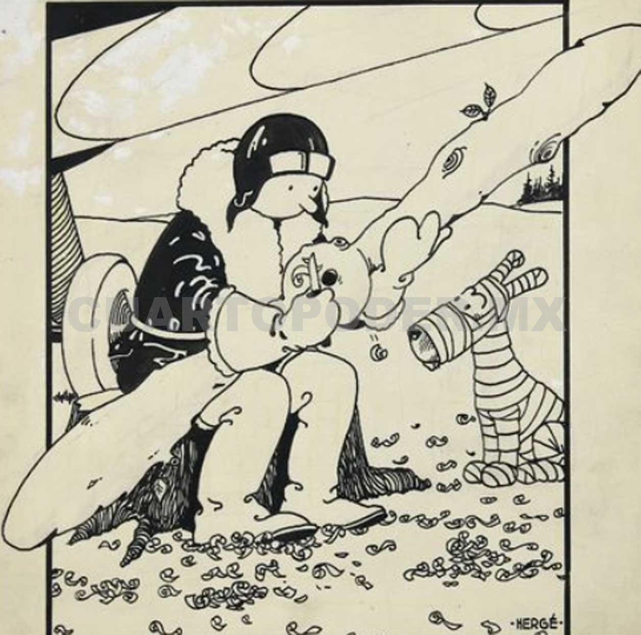 El dibujo fue publicado el 13 de febrero de 1930 y muestra al personaje creado por Hergé en un reportaje en la Unión Soviética, tallando en un tronco de árbol una hélice para su avión mientras que un vendado Milú lo observa.