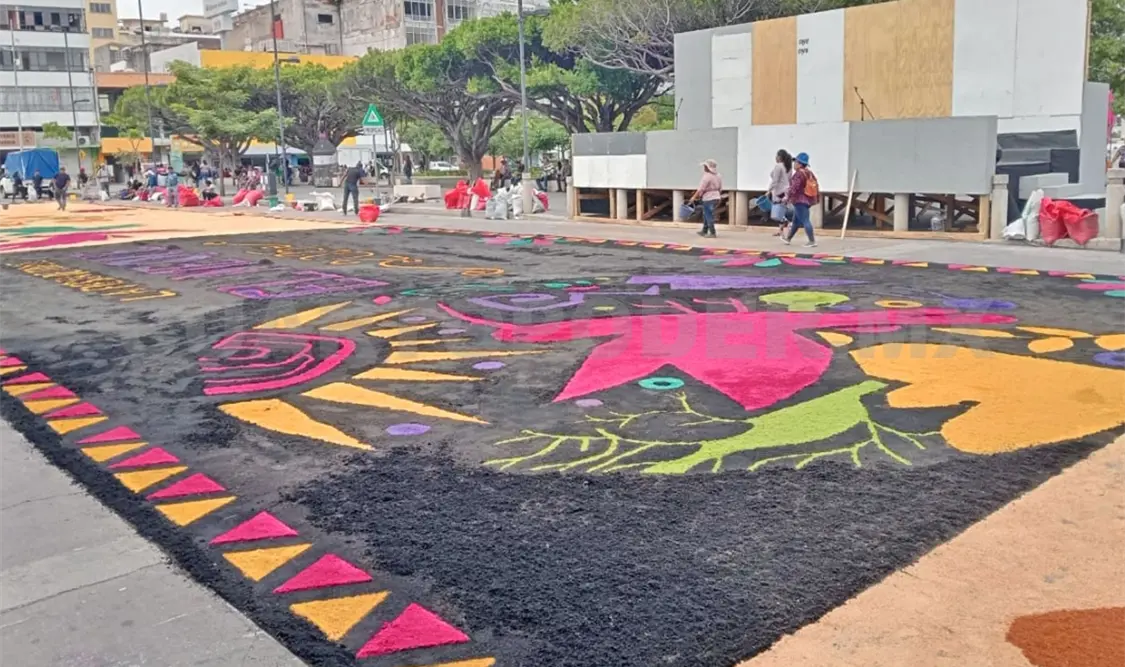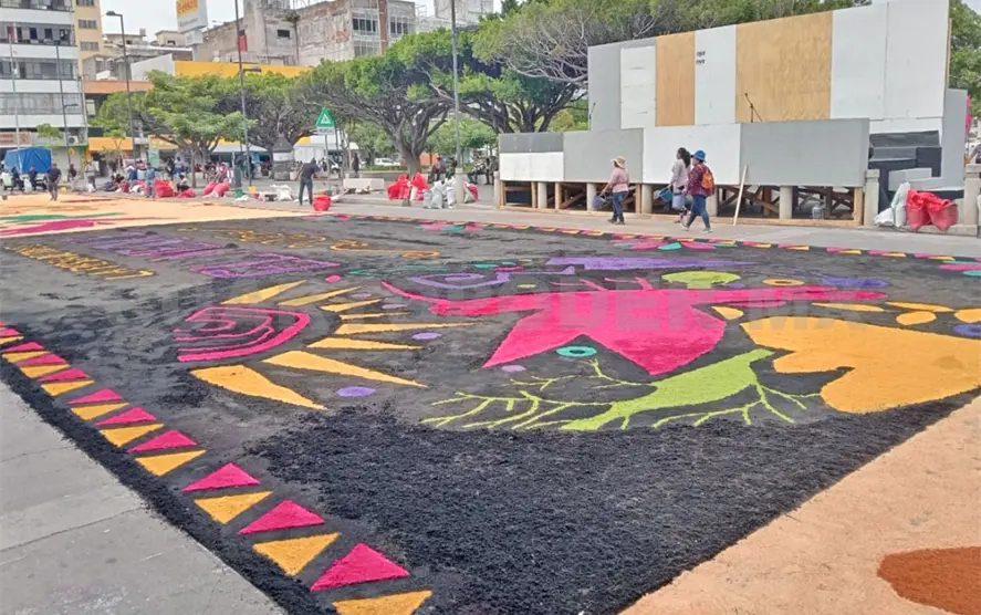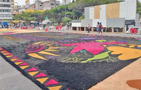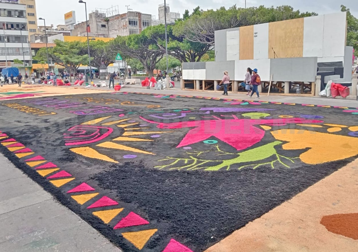 Dijo que fueron alrededor de 42 personas las que se involucraron en la elaboración del tapete, trabajando durante más de 10 horas para su creación. Compartió que el trabajo inició desde la noche del viernes con la creación de los trazos, durante la madrugada comenzaron con el relleno y finalmente con el fondeo de la obra.
