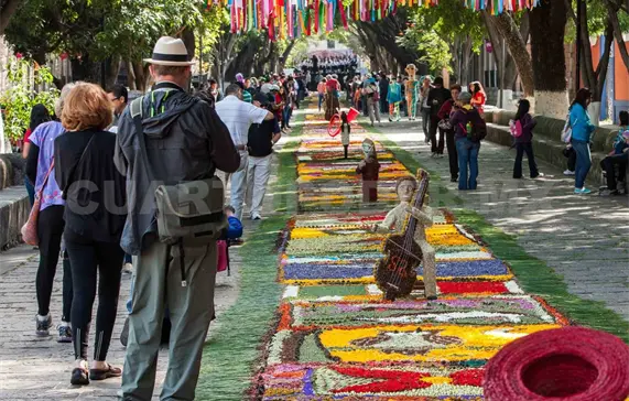 Amapola, pétalos de Cempasúchil, Bugambilia y Margaritas; flores completas de Ave del Paraíso, Gladiolas y otras más, dan forma a los cromos que en conjunto hacen un tapete monumental que asombra a niños, jóvenes y adultos, sin distingos de edad o lugar de procedencia, pues la experiencia es multisensorial.