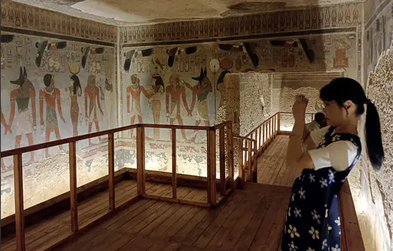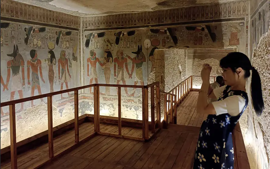 En el centro, los visitantes observaron la enorme tapa de granito del sarcófago de Amenhotep, grabada con jeroglíficos, demasiado pesada para ser retirada como el resto del contenido de la tumba. El sitio fue documentado por primera vez en 1799 durante la breve conquista napoleónica de Egipto. Tras una larga historia de excavaciones, saqueos y graves daños, fue restaurado con el apoyo del gobierno japonés y la UNESCO.