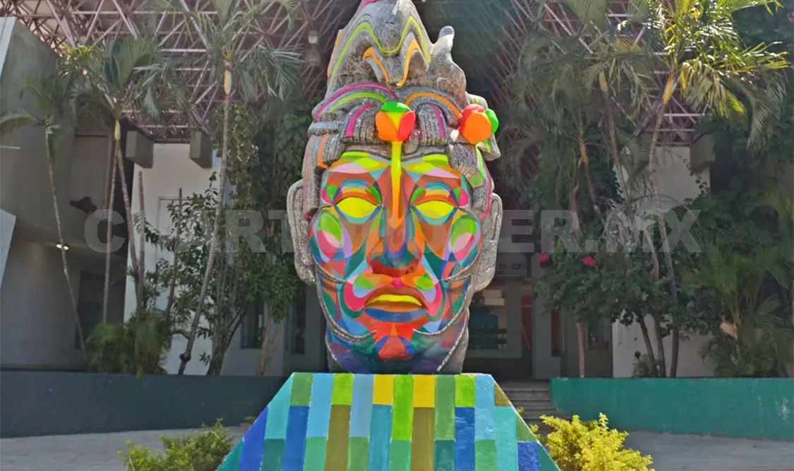 Se trata del trabajo que realizaron el creador oaxaqueño Antonio Triana, mejor conocido como “Cix”, y el tuxtleco Alexander Tadlock, quienes a través de la Fundación Toledo, como parte de su programa Colores Urbanos, intervinieron la figura que alude la cabeza del gobernante maya conocido como Pakal.