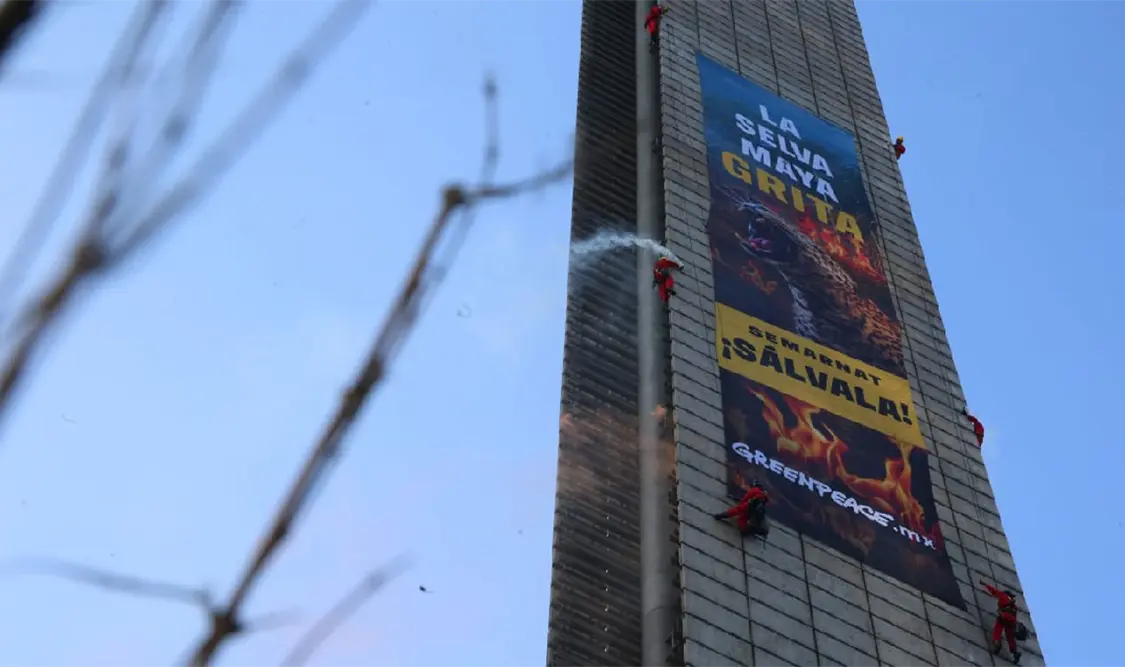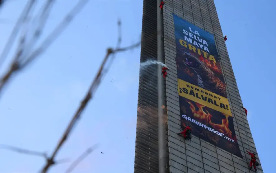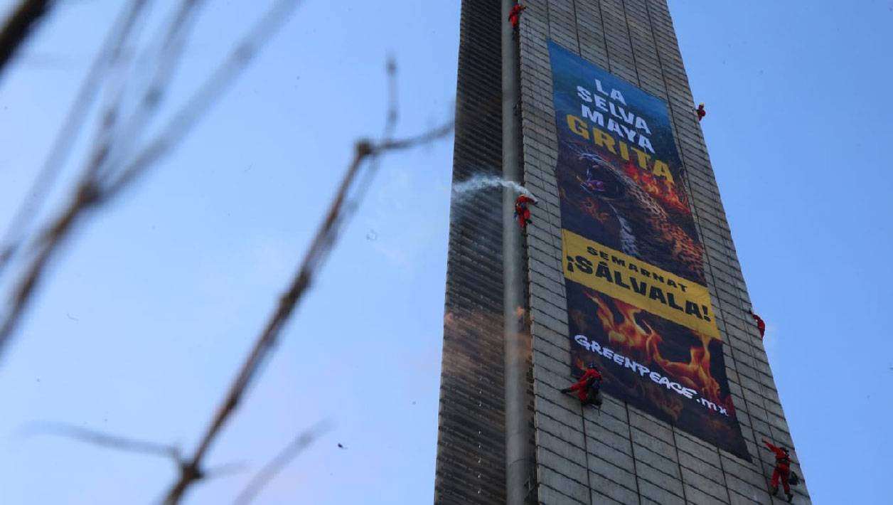 La mañana de este martes, un grupo de activistas de Greenpeace México llevó a cabo una protesta en el monumento a la Estela de Luz, ubicado en la colonia Bosque de Chapultepec Primera Sección, alcaldía Miguel Hidalgo, para exigir al Gobierno Federal medidas inmediatas en favor de la protección de la Selva Maya.