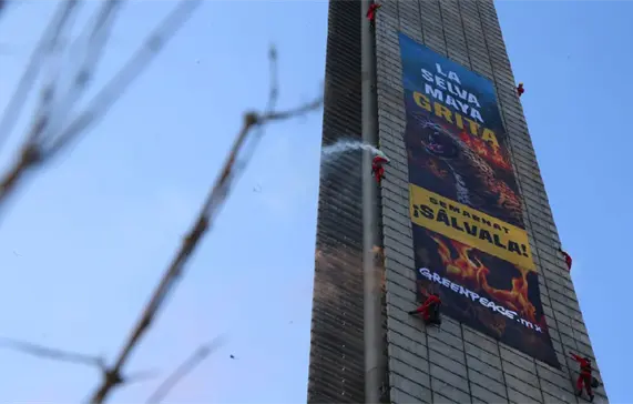 La acción, calificada por la organización como “no violenta”, inició cerca de las 6 de la mañana. En el lugar, los manifestantes desplegaron mensajes en los que denuncian la devastación de la Selva Maya, considerada una de las bio-regiones más importantes del país.