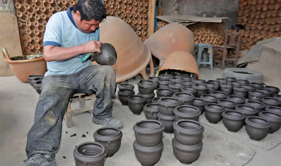 En la entrada del inmueble encontramos el elemento protagonista, costales de barro proveniente del municipio poblano de Amozoc, listo para ser preparado por Víctor Manuel López García, uno de los once hermanos que tiene el señor Genaro, y uno de los pocos que quedan en el taller, ya que los demás parientes decidieron emplearse en trabajos con mejor remuneración.