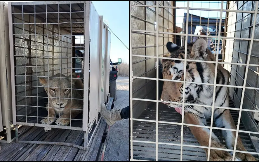 Cinco leones e igual número de tigres rescatados en diferentes situaciones de abandono, junto con 17 burros, una yegua fina, 20 llamas, 20 minipigs, 10 pavorreales, 20 avestruces y aves de granja, entre otros ya fueron trasladados.
