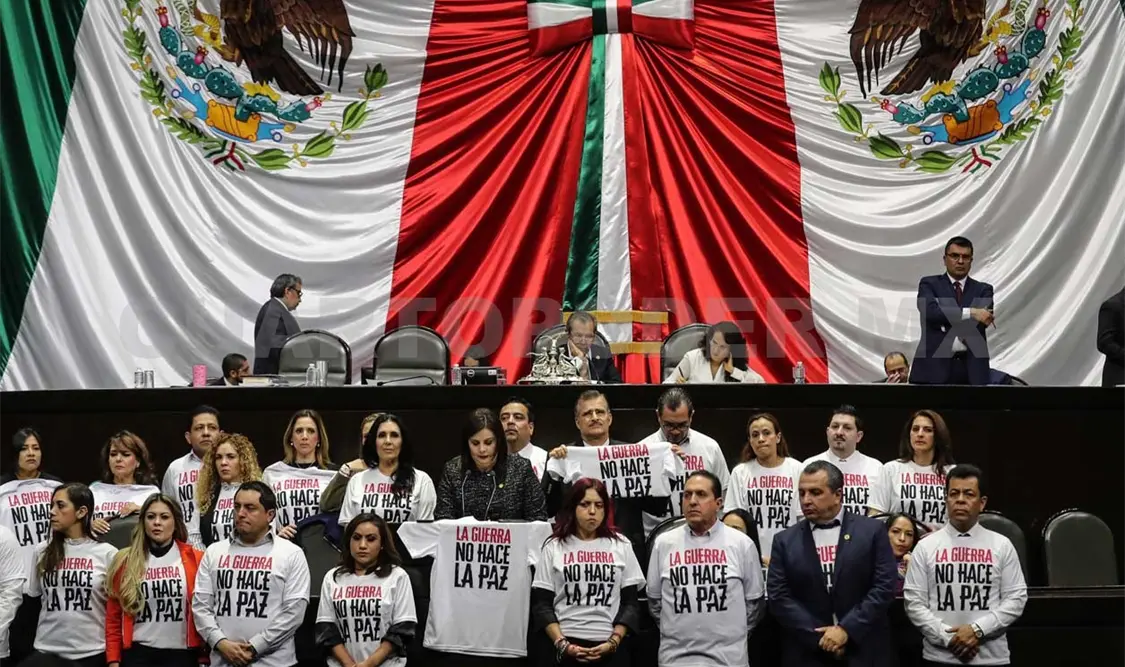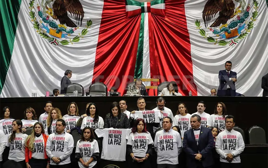 Arropada por sus compañeros de bancada con playeras blancas y la leyenda “La guerra no hace la paz”, la diputada de Movimiento Ciudadano, Adriana Gabriela Medina Ortiz, dio a conocer que su bancada no avalaría ese dictamen porque faltó integrar las observaciones de las audiencias públicas, “además, votar a favor del dictamen y su adenda implica perpetrar en la Constitución una estrategia fallida”.