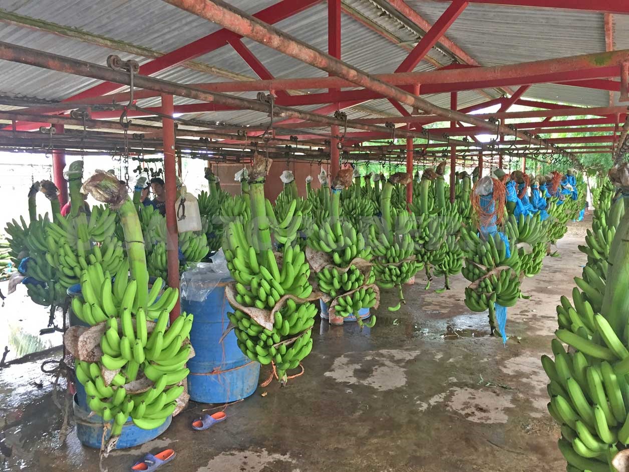 En cada finca existe una red de monorrieles para facilitar la transportación de los racimos cortados hacia las instalaciones de empacado.