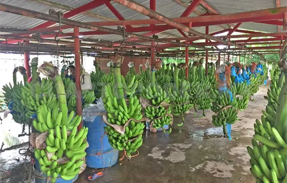 Explicó que allí se revisa la cinta de color, se revisa el grosor adecuado para exportación y la ausencia de algún golpe para pasar el proceso de desmane y selección a cargo de mujeres que depositan el banano en pilas de agua que contiene alumbre para retirarle la savia o látex al banano recién cortado.