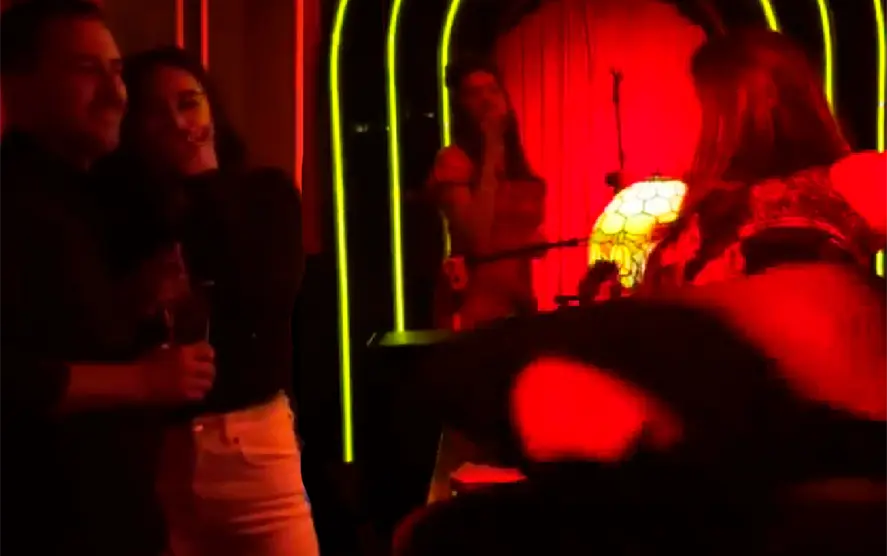 En el video posteado, se observa una habitación con un ambiente a oscuras, iluminado sólo con luces rojas y amarillas, en el centro una mujer baila sensualmente, en ropa interior sobre una mesa, mientras otra canta.