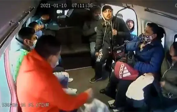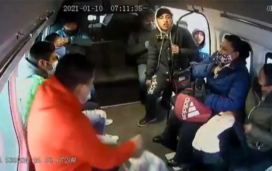 “¡Teléfonos, ya se la saben, quiero los teléfonos rápidamente, rápidamente todos los teléfonos!”, les exigió el sujeto que portaba una pistola, mientras uno de sus compinches también le quita los objetos que llevan los pasajeros que están sentados cerca de la puerta.