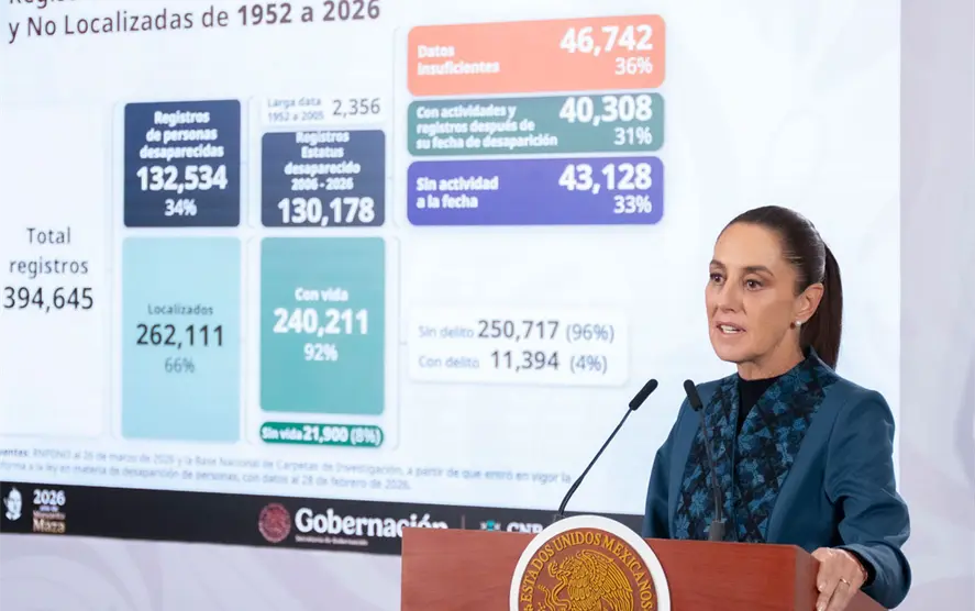 Durante la presentación del informe sobre personas desaparecidas en Palacio Nacional, la mandataria explicó que estas cifras derivan de un análisis del Registro Nacional de Personas Desaparecidas y No Localizadas, el cual permitió depurar y clasificar los casos existentes.