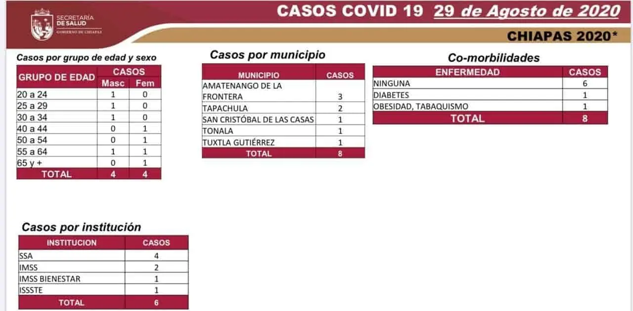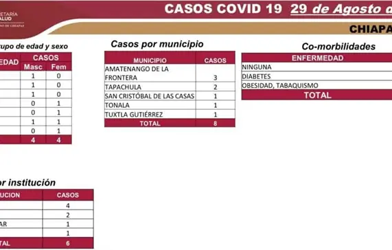 Los casos nuevos se registraron en los siguientes municipios: Amatenango de la Frontera, tres; Tapachula, dos; y San Cristóbal de Las Casas, Tonalá y Tuxtla Gutiérrez, un caso cada uno. Se trata de cuatro hombres y cuatro mujeres.