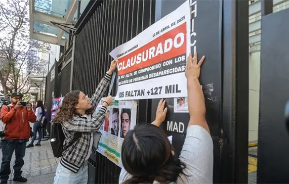 En punto de las diez de la mañana, las rastreadoras y buscadores pegaron un sello de clausura frente a la Puerta 3 del recinto legislativo. Junto a él, colocaron cientos de fichas de búsqueda con las identidades de los familiares que buscan o que han encontrado en fosas clandestinas, y por los que no aún tienen justicia debido a la inacción de fiscalías locales.