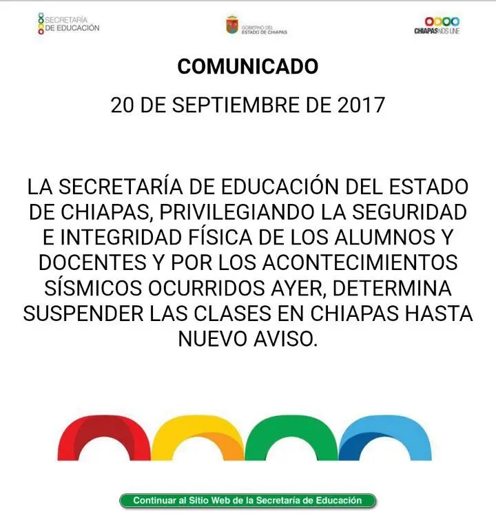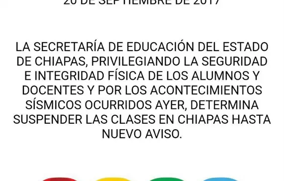 "La Secretaría de Educación del Estado, privilegiando la seguridad e integridad física de los alumnos y docentes y por los acontecimientos sísmicos ocurridos ayer, determina suspender las clases en Chiapas hasta nuevo aviso", es el aviso que se ha publicado en las redes sociales de la Secretaría de Educación del gobierno de Chiapas.