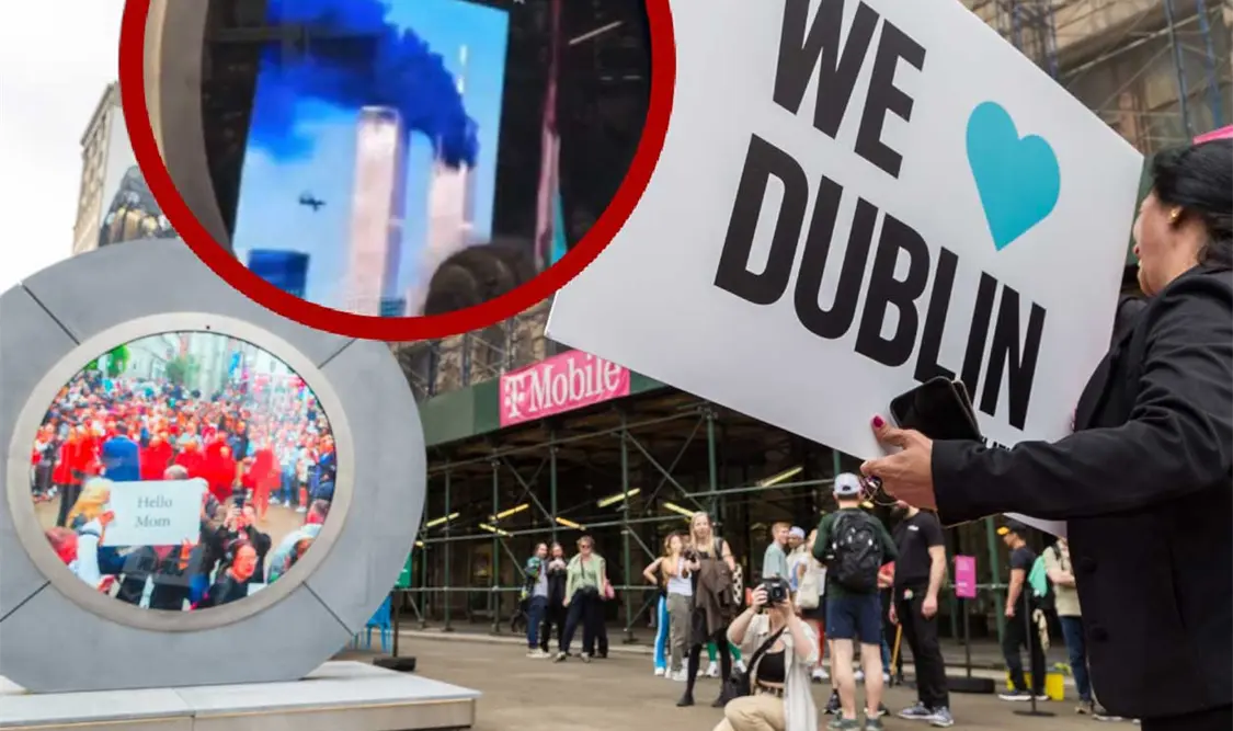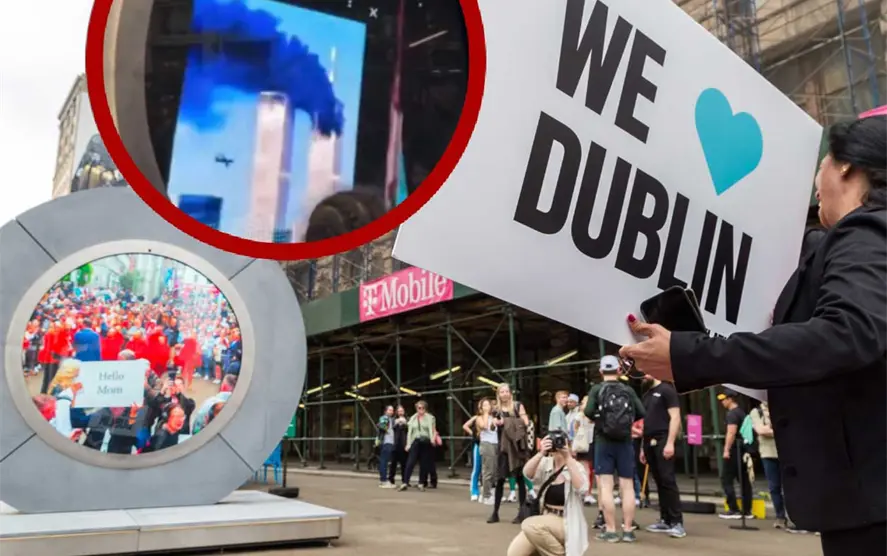 Por medio de la plataforma X, el usuario @ceciarmy compartió un video donde se aprecia el aparato circular transmitiendo imágenes entre las ciudades de Nueva York y Dublín.