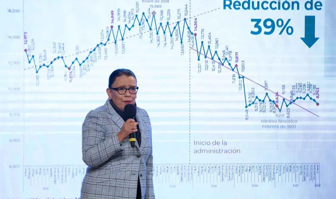 Rosa Icela Rodríguez, titular de Seguridad y Protección Ciudadana (SSPC), informó que la incidencia delictiva del fuero federal bajó en 41.37 %, pues destacó que al inicio del gobierno, en diciembre de 2018, se cometían nueve mil 62 delitos del fuero federal, mientras que en enero de 2022 se registraron cinco mil 313.