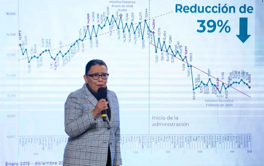 En el salón Tesorería de Palacio Nacional, Rosa Icela Rodríguez indicó que el robo total ha bajado 28 % con respecto al mismo mes de 2019, sin embargo, en comparación con enero de 2021, subió 5.6 %.