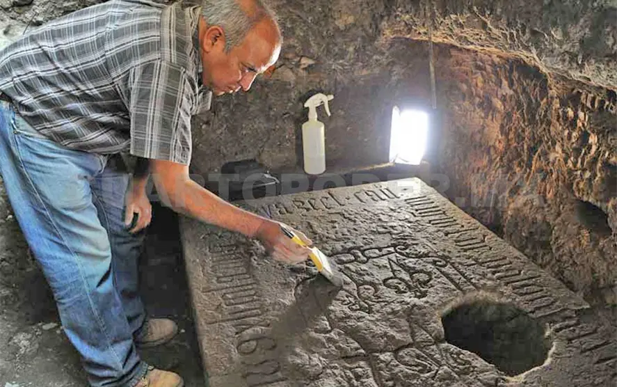 El arqueólogo Raúl Barrera Rodríguez, responsable del PAU, explicó que el pozo de sondeo (de 1.60 x 1.60 m) donde se localizó la lápida de Miguel de Palomares se ubica de frente a la puerta central de la portada de la Catedral.