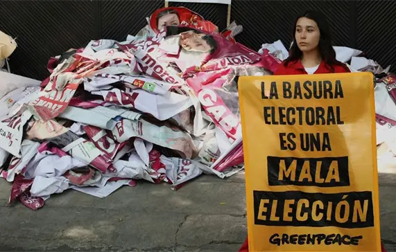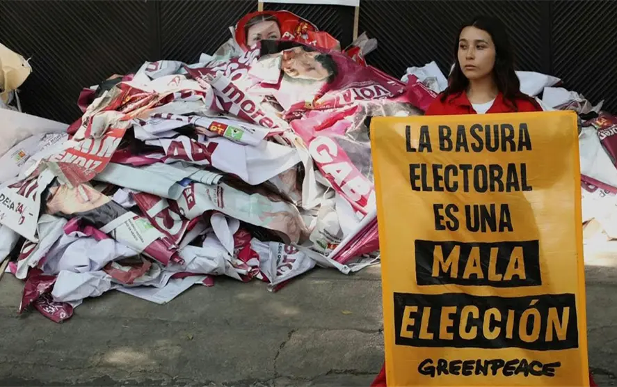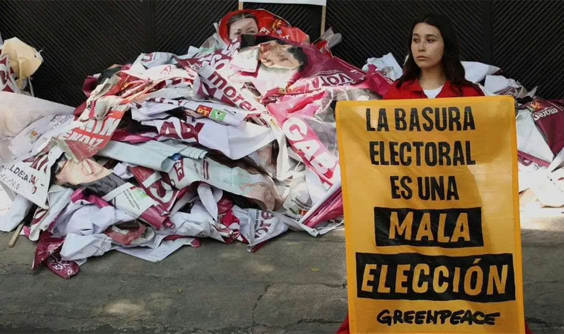 Activistas de la organización ambientalista internacional Greenpeace México, hicieron un llamado a los candidatos de los diferentes partidos políticos y líderes de coaliciones a “hacerse cargo” de pendones y lonas de propaganda, también llamada “basura electoral”.