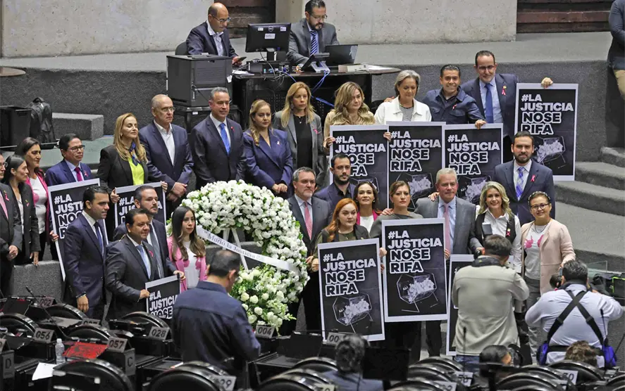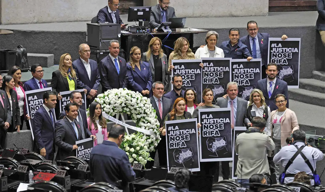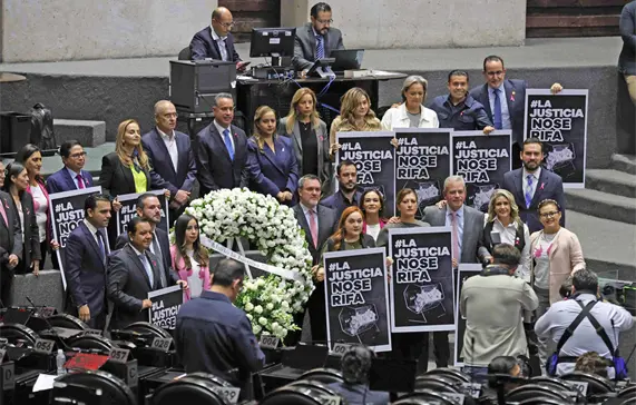 El diputado del PRI, Emilio Suárez Licona, pasó acompañado de las y los integrantes de su bancada, quienes pusieron una corona fúnebre al centro con la leyenda “La justicia a muerto”: Finalmente, el diputado Alberto Maldonado, de Morena, sentenció: “No olvidemos que el pueblo manda, el pueblo pone y el pueblo quita. Las personas juzgadoras resolverán sus asuntos judiciales, pero será el pueblo quien decida quiénes serán sus jueces”.