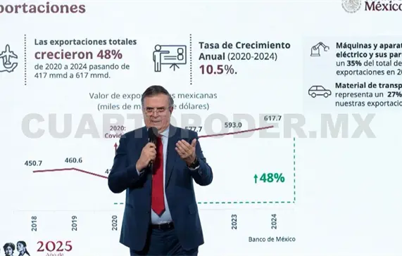 El secretario de Economía compartió como segunda buena noticia el comportamiento de las exportaciones mexicanas, las cuales —pese a escenarios económicos globales complejos— continúan mostrando una tendencia ascendente.