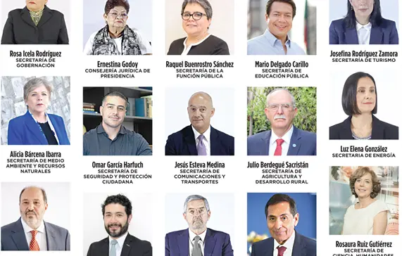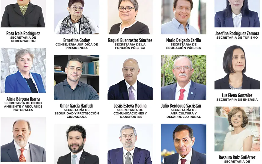 Al momento, la presidenta electa de México ha dado a conocer un total de 20 nombres, faltan los titulares de Semar y SedenaMarcelo EbrardSecretaría de EconomíaRosa Icela RodríguezSecretaría de GobernaciónErnestina GodoyConsejería Jurídica de PresidenciaRaquel Buenrostro SánchezSecretaría de la Función PúblicaMario Delgado CarilloSecretaría de Educación PúblicaClaudia Curiel de IcazaSecretaría de CulturaJosefina Rodríguez ZamoraSecretaría de TurismoAlicia Bárcena IbarraSecretaría de Medio Ambiente y Recursos NaturalesOmar García HarfuchSecretaría de Seguridad y Protección CiudadanaJesús Esteva MedinaSecretaría de Comunicaciones y TransportesJulio Berdegué SacristánSecretaría de Agricultura y Desarrollo RuralLuz Elena GonzálezSecretaria de EnergíaLázaro Cárdenas BatelJefe de la Oficina de la PresidenciaMarath Baruch Bolaños LópezSecretaría del Trabajo y Previsión SocialJuan Ramón de la FuenteSecretaría de Relaciones ExterioresRogelio Ramírez de la O.Secretaría de Hacienda y Crédito PúblicoRosaura Ruiz GutiérrezSecretaría de Ciencia, Humanidades, Tecnología e InnovaciónDavid KershenobichSecretaría de SaludAriadna Montiel ReyesSecretaría de BienestarEdna Vega RangelSecretaría de Desarrollo Agrario, Territorial y UrbanoSecretaría de la DefensaPendienteSecretaría de MarinaPendiente
