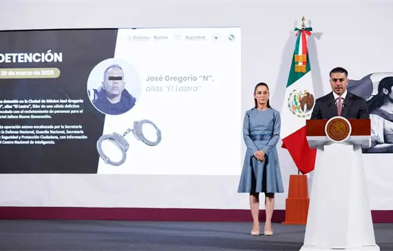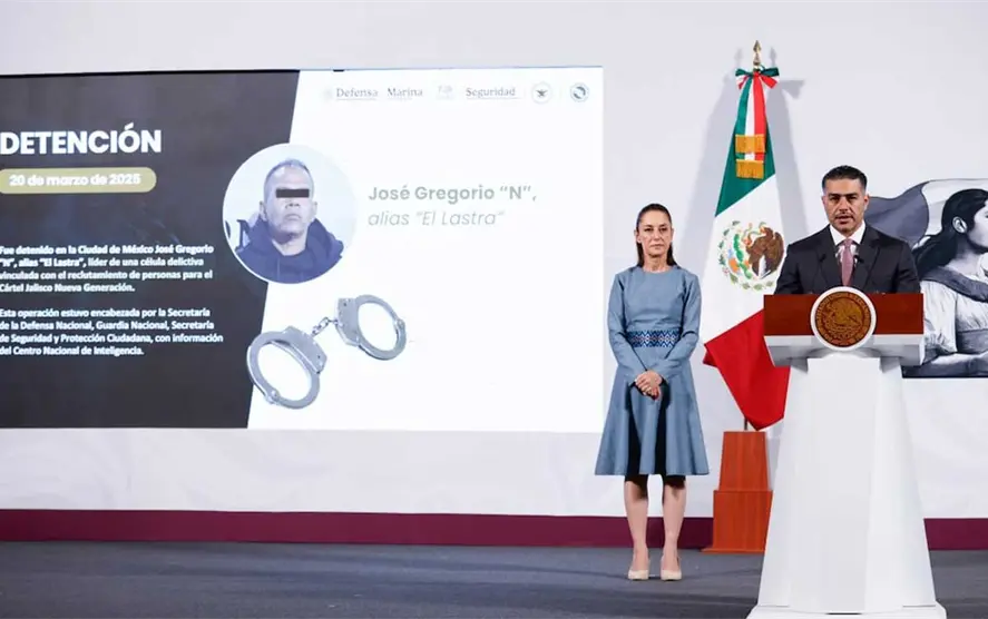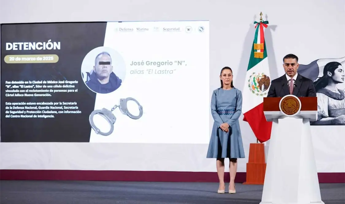 El secretario de Seguridad y Protección Ciudadana, Omar García Harfuch, informó que este fin de semana se llevó a cabo la detención de José Gregorio “N”, alias “El Lastra”, vinculado con el caso del rancho Izaguirre en Teuchitlán, y quien se identificó como líder de la célula delictiva responsable del reclutamiento de personas para Cártel Jalisco Nueva Generación.