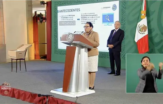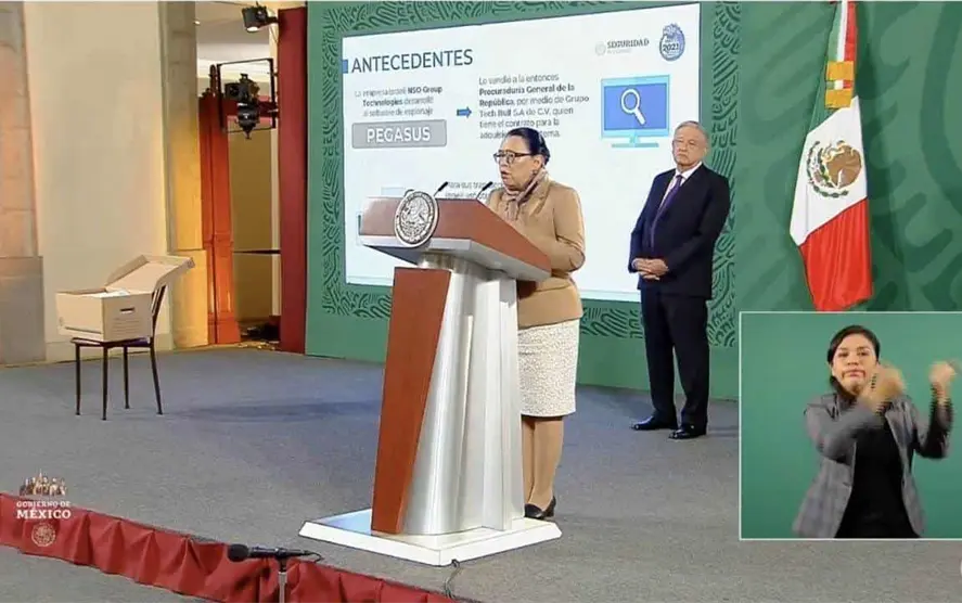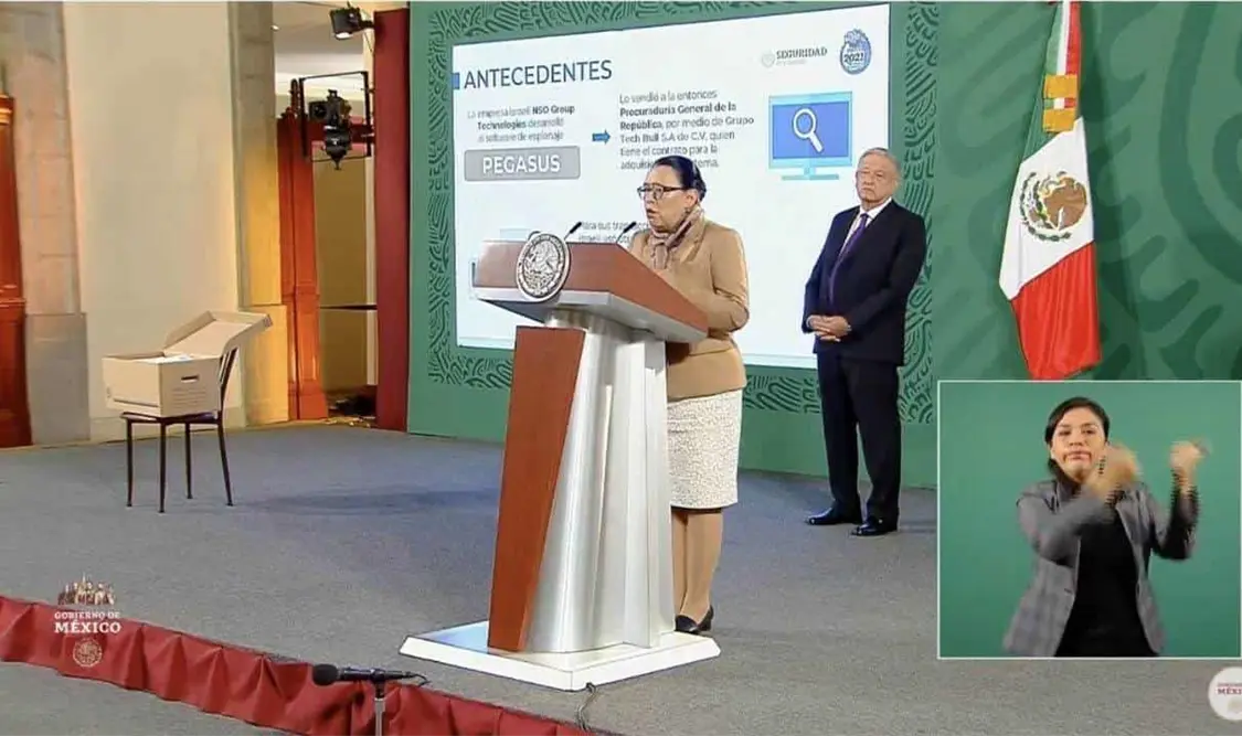 CdMx.- La secretaria de Seguridad y Protección Ciudadana, Rosa Icela Rodríguez informó que en los archivos de la dependencia, Segob y Cisen así como órganos descentrados se encontraron 31 contratos con diversas empresas "fachada" relacionadas con "Pegasus", por conceptos como el uso de tecnología de inteligencia.