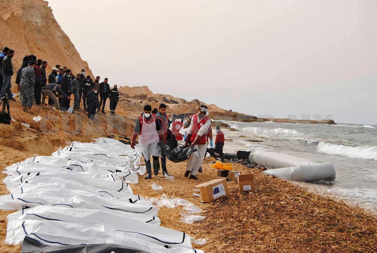 La Media Luna Roja Libia divulgó en su cuenta de Twitter fotografías de decenas de cuerpos y otros ya en bolsos negros y blancos alineados en la costa.