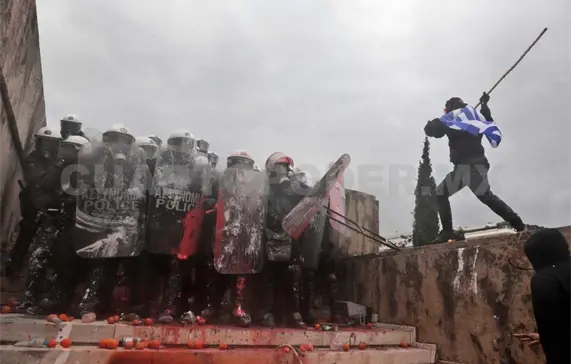 Al inicio de la protesta, los manifestantes expresaron en calma su rechazo al cambio de nombre de Macedonia, pero minutos después algunos se enfrentaron con policías antidisturbios en los escalones que llevan al edificio del Parlamento, lanzándoles piedras, bombas incendiarias, pintura y otros objetos.