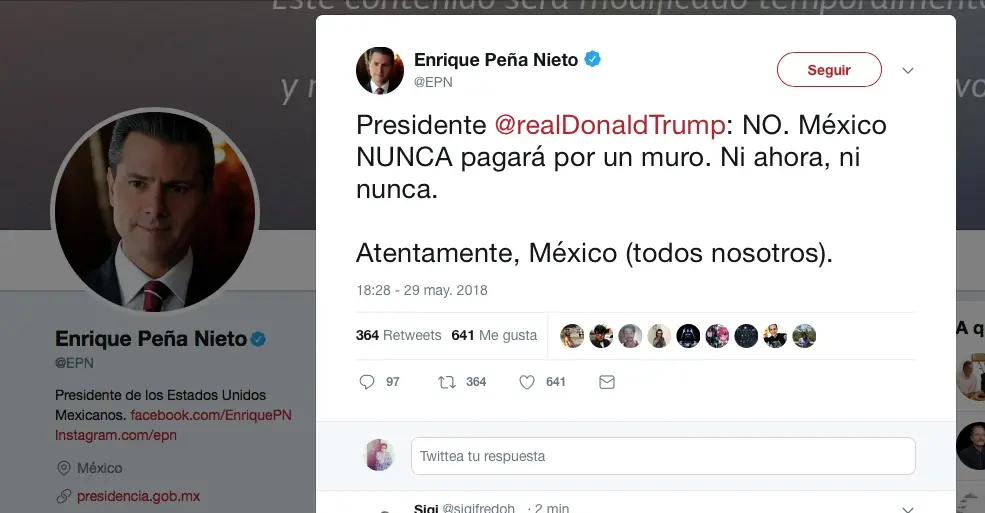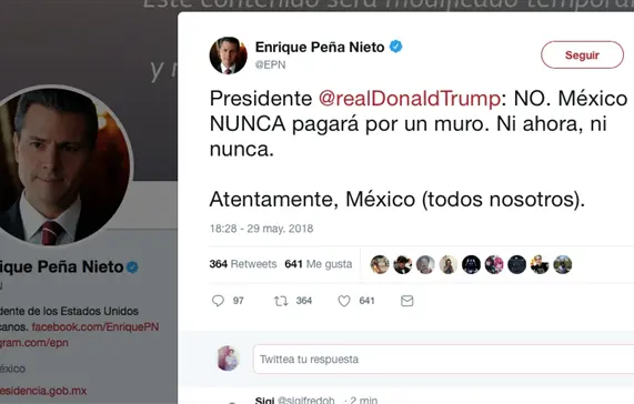 El presidente de México, Enrique Peña Nieto, reitera que nuestro país no pagará el muro, ello tras las declaraciones de este día de Donald Trump quien asegura que disfrutará cuando México pague la obra.