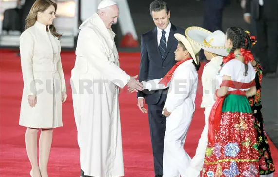 El jerarca de la Iglesia Católica bajó de la aeronave y fue recibido por el Ejecutivo federal y su esposa, para después, como primer gesto, bendecir un cofre con tierra mexicana que le entregaron niños de Oaxaca, Puebla, Veracruz y Jalisco vestidos con trajes típicos, bajo luces amarilla y blanca, los colores del Estado Vaticano.