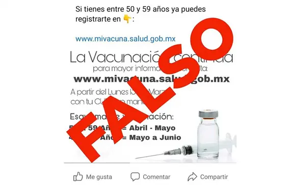 Tanto en redes sociales como en WhatsApp, circula una captura de pantalla en la que se lee “Si tienes entre 50 y 59 años, ya puedes registrarte”, y adjunta el enlace al sitio web http://www.mivacuna.salud.gob.mx/.