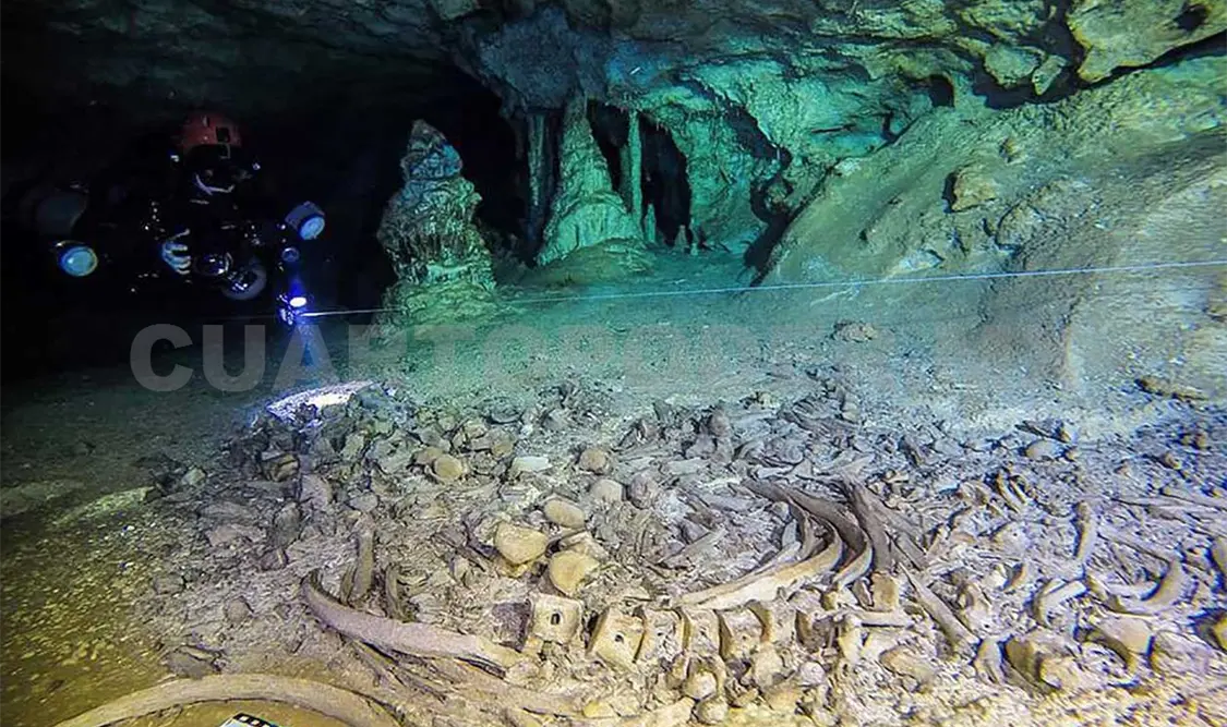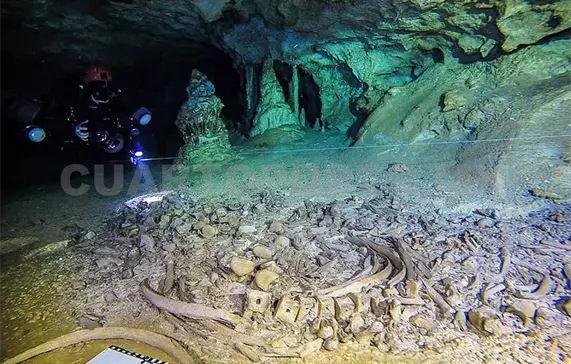 En esas galerías inundadas, el equipo que cuenta con apoyo del INAH y National Geographic, han localizado contextos únicos y peculiares, como una cueva con restos de fauna del Pleistoceno incrustados en la pared. Según el arqueólogo, estos restos podrían suponer “un evento catastrófico que permitió que estos huesos quedaran en ese lugar. Aún falta determinar a qué pertenecen estos huesos pero se está integrando un paleontólogo en residencia al proyecto, para entender estos contextos y cuidarlos como se debe”.