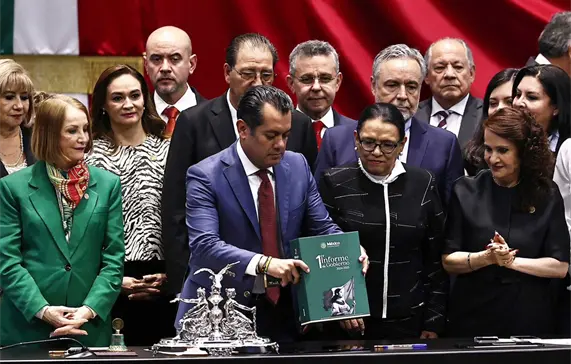 Ya en la tribuna, la secretaria entregó el informe al presidente de la Mesa Directiva, Sergio Gutiérrez Luna, se tomaron la fotografía oficial, mientras los congresistas guindas gritaban “¡Es un honor estar con Claudia hoy!”.