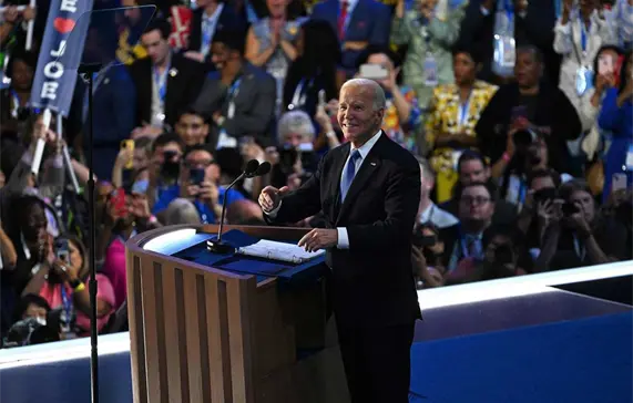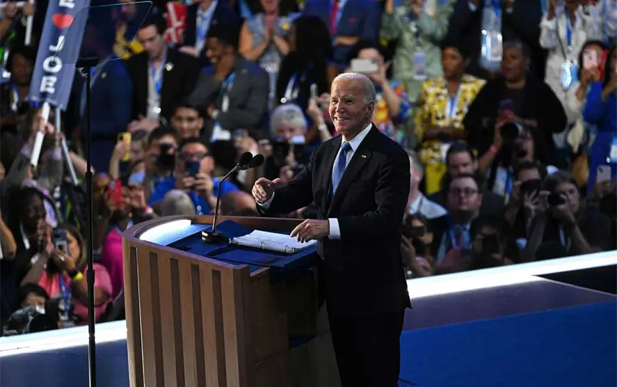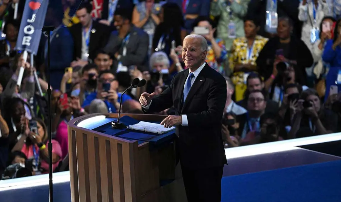 Ante la presencia de la candidata a la presidencial, Kamala Harris, Joe Biden comenzó su discurso con un tono positivo, donde recibido por los asistentes a la Convención Nacional Demócrata en Chicago con aplausos y gritos de “We love you Joe” (Te queremos Joe) mientras agitaban pancartas azules con el mismo mensaje y corazones rojos.