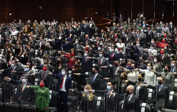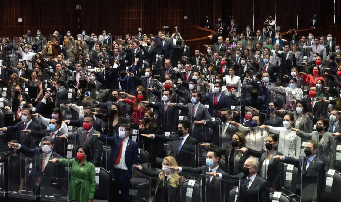 Enseguida, el presidente de Decanos, Gómez Villanueva, tomó la protesta a los diputados electos presentes, quienes se pusieron de pie y extendieron su brazo derecho: