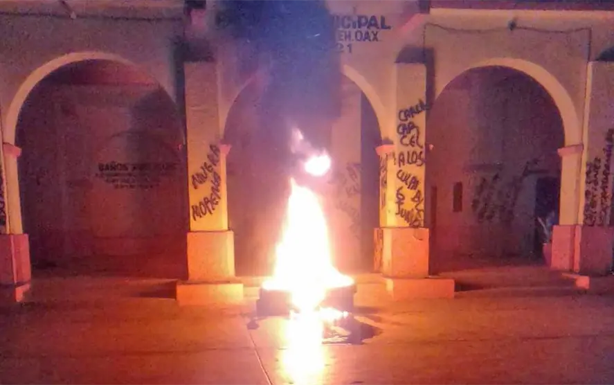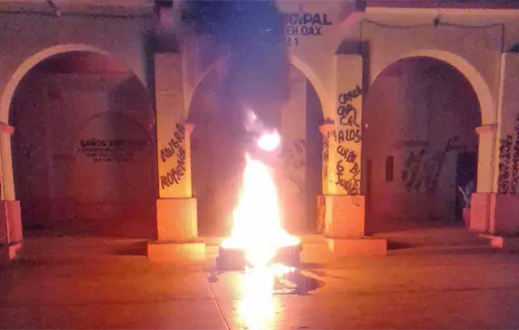 La noche de este viernes un grupo de personas realizaron pintas, quemaron una motocicleta y neumáticos frente al Palacio Municipal de Santiago Laollaga, en el Istmo de Tehuantepec, para manifestar su oposición contra las elecciones extraordinarias que se realizarán en marzo en la población.