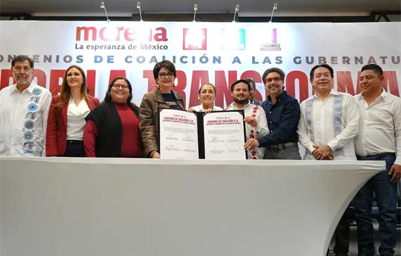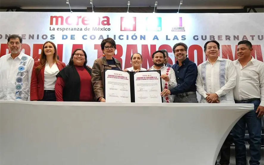 El presidente nacional de Morena, Mario Delgado, y la Coordinadora de Defensa de la Transformación, Claudia Sheinbaum, aseguraron que la coalición Morena-PT-PVEM va “por todo” en las elecciones federales y locales del 2024. Por esta razón, los tres partidos firmaron su primer acuerdo de coalición en la Ciudad de México, Jalisco, Tabasco y Yucatán, antes del inicio de precampañas en estas entidades. Delgado y Sheinbaum adelantaron que Morena, PT y PVEM firmarán el convenio de coalición federal el próximo 19 de noviembre, y recalcaron que el acuerdo firmado este 3 de noviembre se da antes del inicio de precampañas en Ciudad de México, Jalisco y Yucatán (5 de noviembre), así como Tabasco (15 de noviembre).