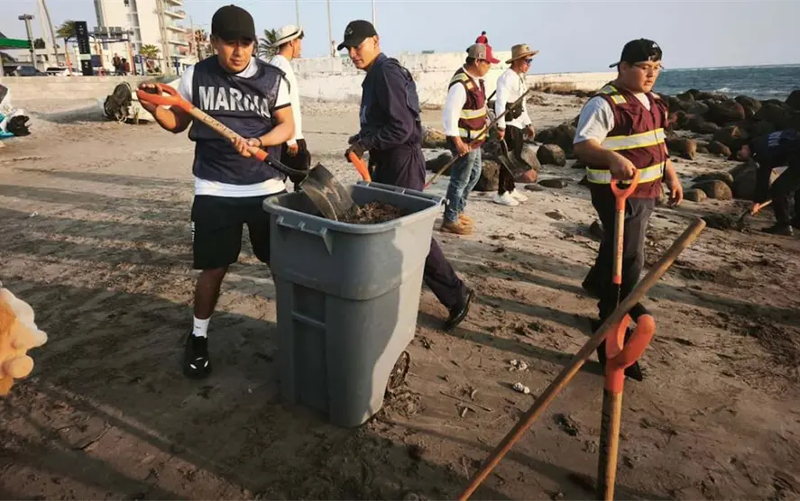 Elementos de distintas corporaciones e instituciones llevaron a cabo la limpieza de 34 playas del centro y sur de Veracruz que habían sido afectadas por manchas de hidrocarburo.
