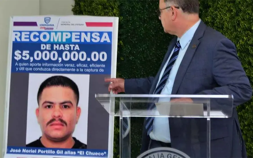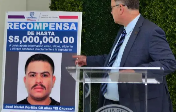 La Fiscalía General del Estado de Chihuahua (FGE) ofrece una recompensa de hasta cinco millones de pesos a quien o quienes aporten información que conduzca directamente a la captura de José Noriel Portillo Gil, alias “El Chueco”.