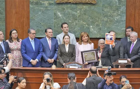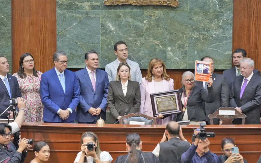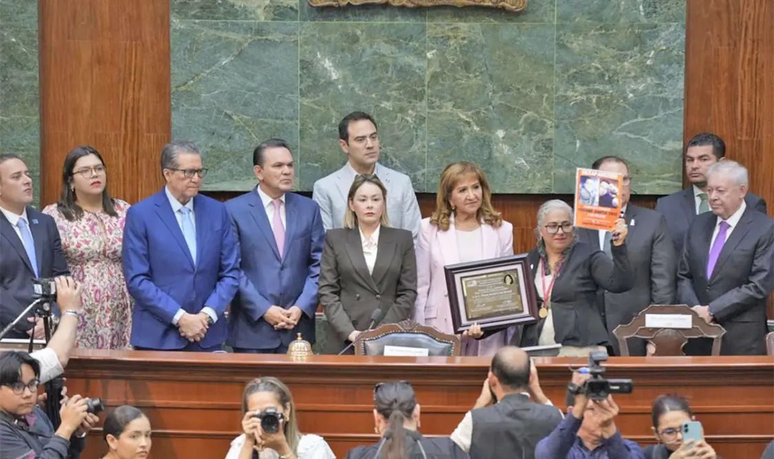En el salón de sesiones del Poder Legislativo, los canticos de los diversos colectivos de búsqueda presentes, de “Hijo escucha, tu madre está en la lucha” y “Vivos se los llevaron, vivos los queremos”, la luchadora social y rastreadora fue homenajeada.