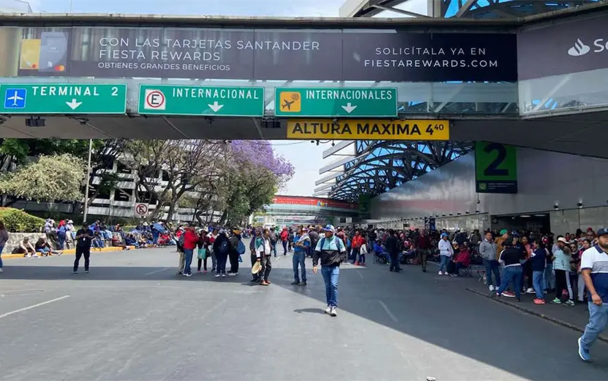 En la terminal número 2 “Benito Juárez” los accesos peatonales y vehiculares se vieron bloqueados por una barrera humana y con piedras impedían el paso a los pasajeros quienes caminaron aproximadamente un kilómetro, con maletas en mano, para poder abordar su avión.