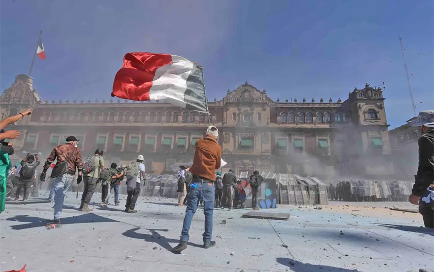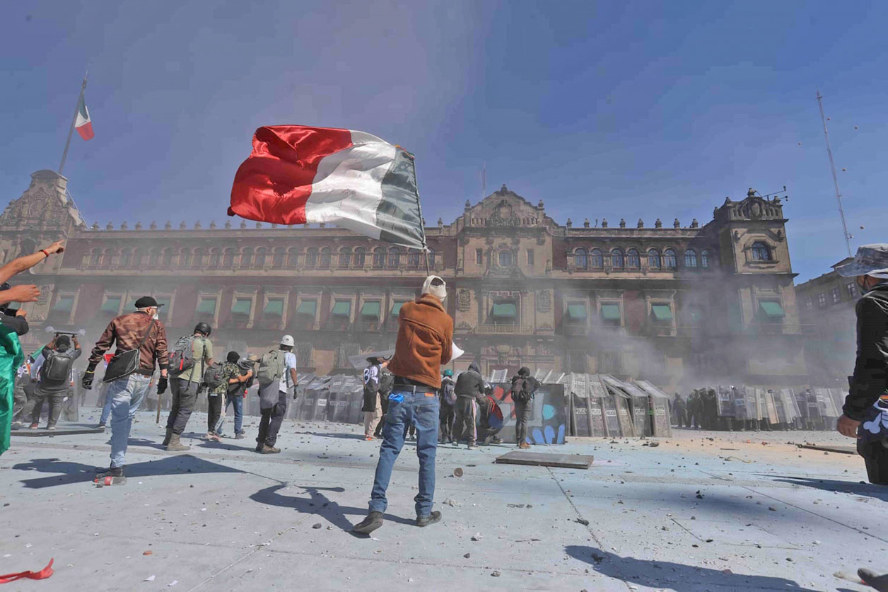 Durante media hora, policías y manifestantes se enfrentan en la explanada del Zócalo Capitalino y con golpes, trataron de aproximarse al recinto legislativo para derribar las puertas e ingresar por primera vez para encarar al gobierno de la presidenta Claudia Sheinbaum.