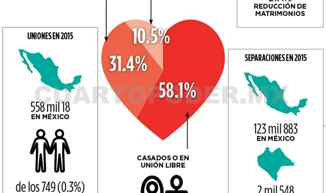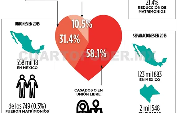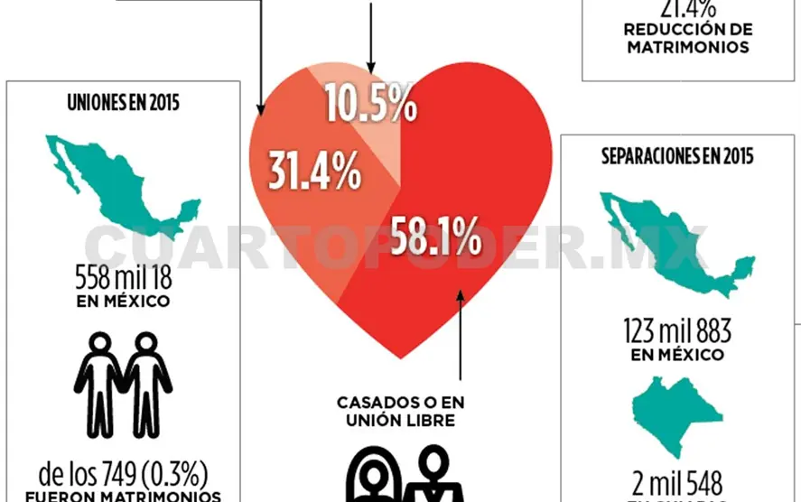 Este martes se celebra en México el Día del Amor y la Amistad, por lo que presentamos el panorama general de matrimonios y divorcios entre la población mexicana. Entre las cifras, destaca que de 2000 y 2015 aumentaron las separaciones debido, en parte, a que un mayor número de personas deciden vivir en unión libre, dando paso a menor número de uniones legales.