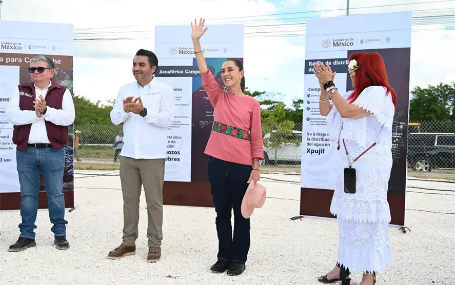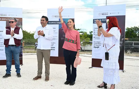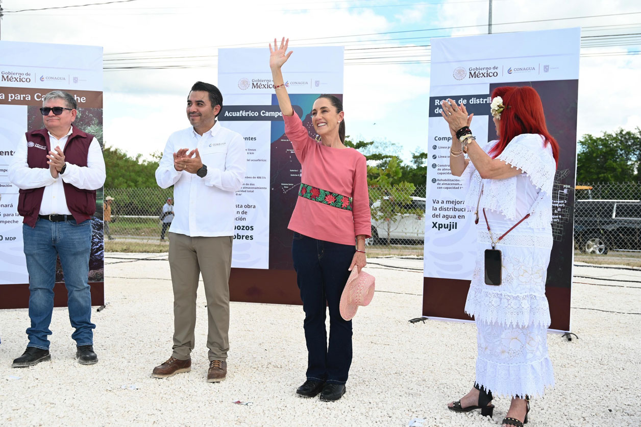 Acompañada por la gobernadora Layda Sansores, la jefa del Ejecutivo federal indicó que dentro del proyecto “Agua para Campeche” se construirá una batería de pozos a 30 kilómetros de la ciudad de Campeche, un acueducto y seis tanques de almacenamiento para sustituir los actuales pozos que ya suministran agua salitrosa.