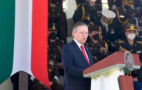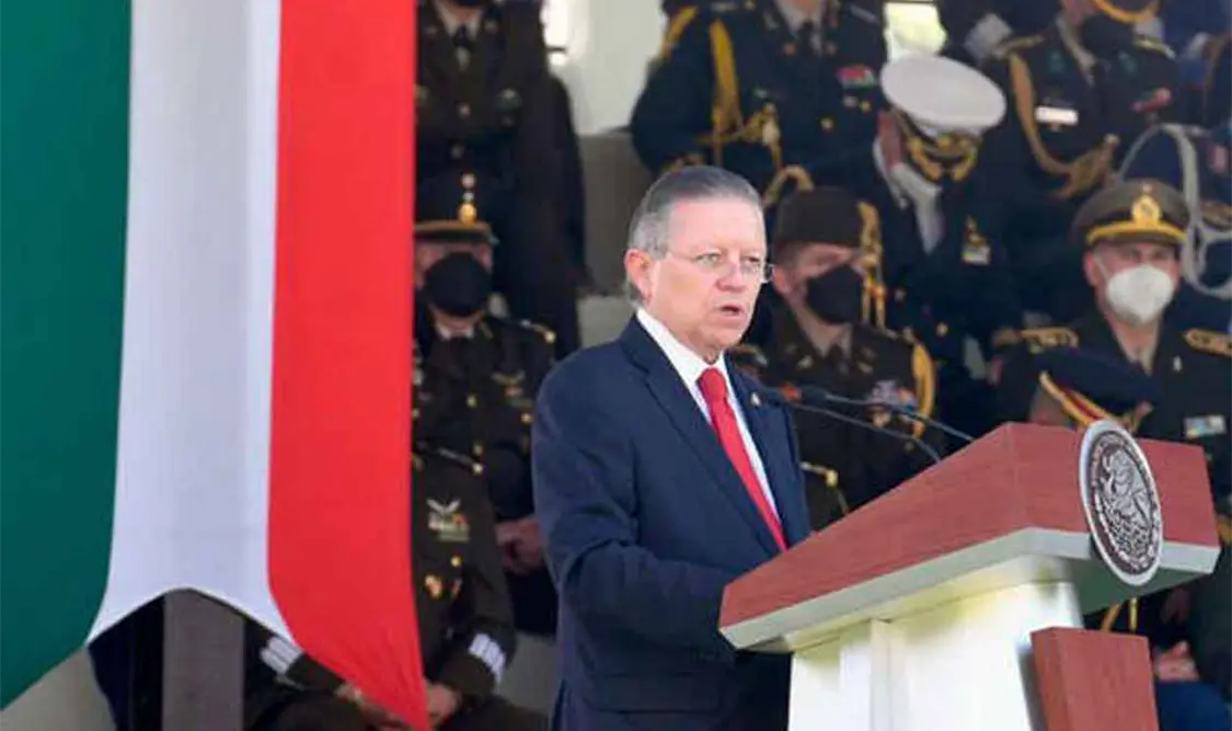 Como orador en la ceremonia del Día de la Bandera realizada en el Campo Marte, ante el presidente Andrés Manuel López Obrador, los presidentes del Congreso, Gabinete y la jefa de Gobierno de la Ciudad de México, Claudia Sheinbaum, el presidente del Poder Judicial expresó que el futuro se construye en democracia y desde la Constitución, sus valores y principios.
