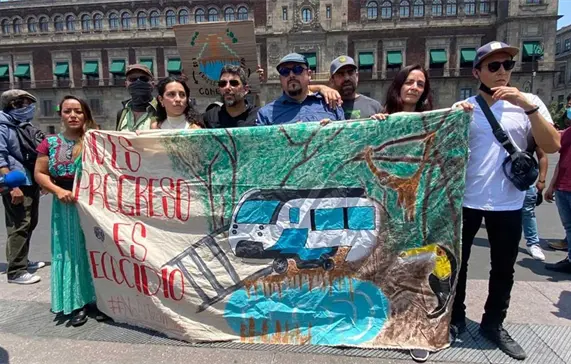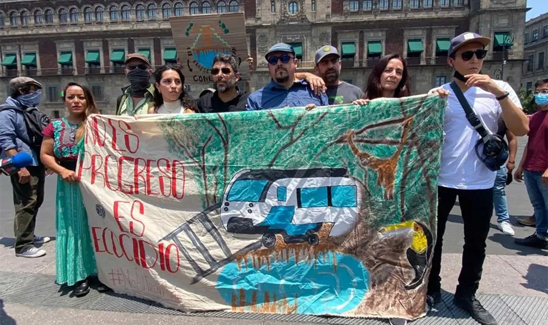Integrantes del colectivo “Sélvame del Tren” se manifestaron este lunes frente a Palacio Nacional en donde reprocharon al presidente Andrés Manuel López Obrador haber cancelado la reunión que tenía programada para este lunes y lo exhortaron a visitar el Tramo 5 del Tren Maya, para que la obra se realice sin afectaciones a los cenotes y a los ríos subterráneos.