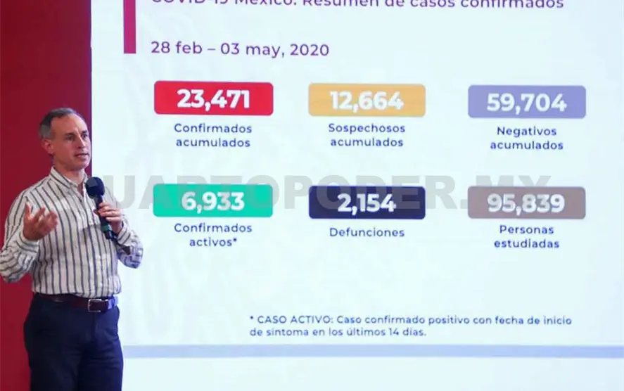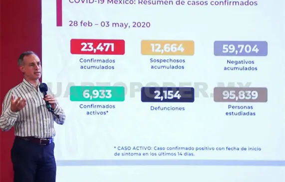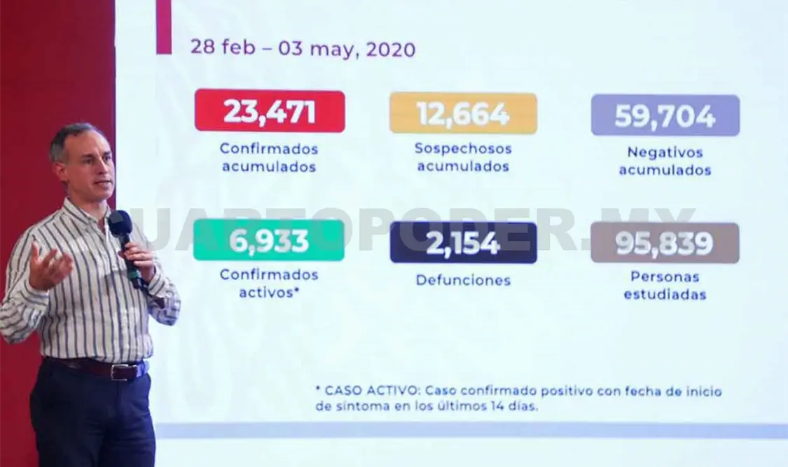 Hugo López-Gatell Ramírez, subsecretario de Prevención y Promoción de la Salud de la Secretaría de Salud, informó que hasta ayer, México suma 23 mil 471 casos positivos de Covid-19 y dos mil 154 defunciones a causa del virus.